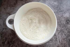 - Mehl, Zucker und Salz, sowie die Zitronenschale in eine Schüssel geben und vermengen.