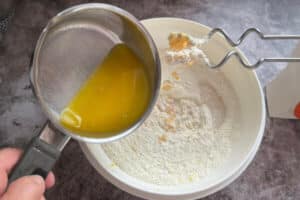 - Die Hefemilch, die geschmolzene Butter und die Eigelbe in der Rührschüssel unterrühren und alles zu einem glatten Hefeteig verkneten.