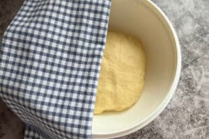 - Teig mischen & gehen lassen: Alle Zutaten zu einem glatten Hefeteig kneten. Warm ruhen lassen, bis der Teig sichtbar aufgeht.