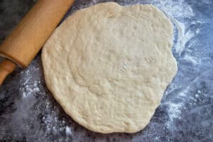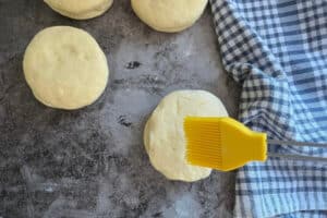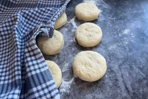 - Ausrollen & ausstechen: Teig gleichmäßig auf 2–3 cm dick ausrollen, Kreise ausstechen und nochmal ruhen lassen.