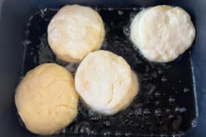 - Deckel abnehmen, Krapfen wenden und offen fertig ausbacken, bis sie goldbraun sind und der typische weiße Ring zu sehen ist.