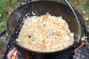 Ein guter Kessel sollte gleichmäßig Hitze speichern. Wer draußen am Feuer kocht, legt Holz regelmäßig nach, um eine gleichbleibende Temperatur zu halten.