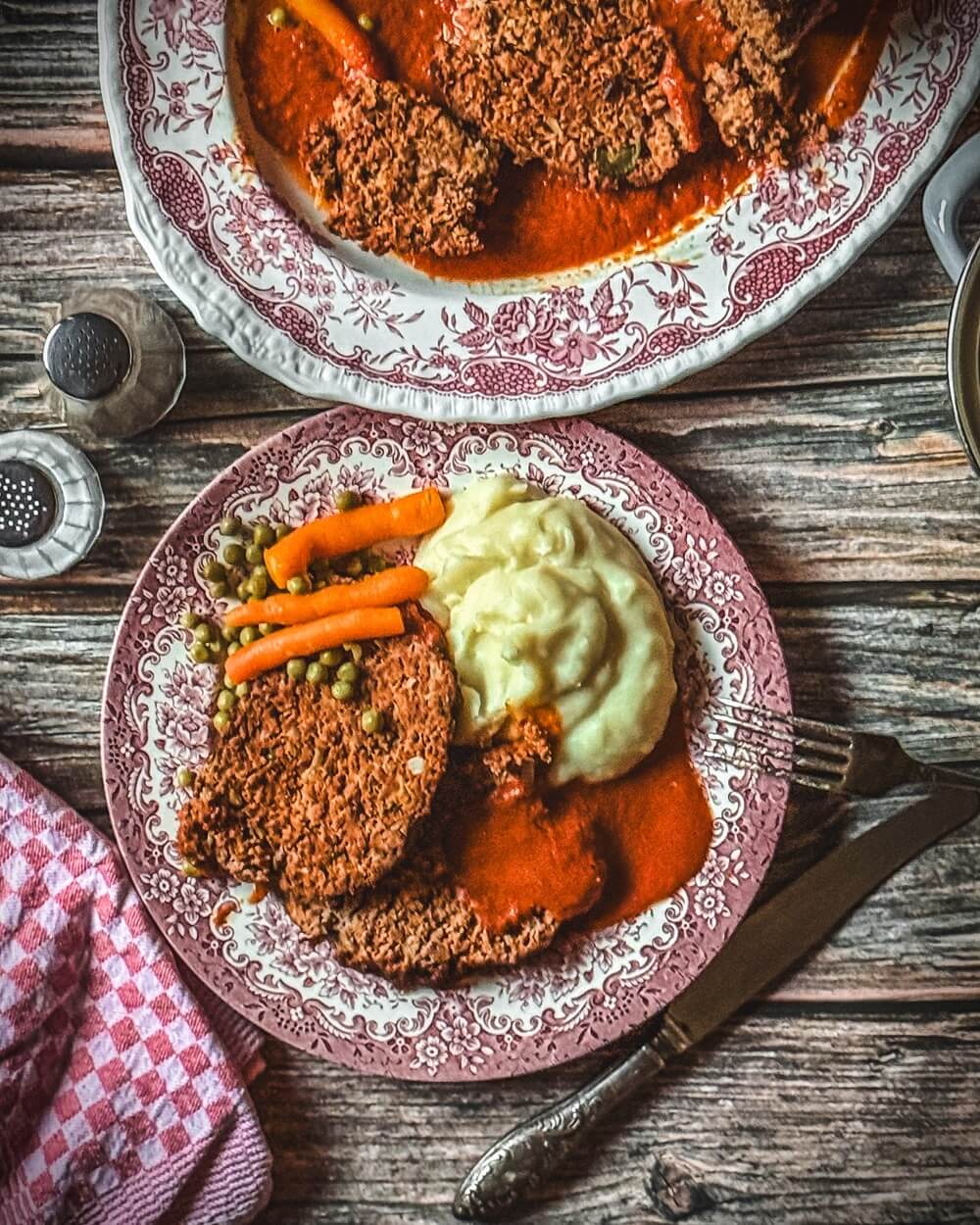 • Klassischer Hackbraten: pur, mit wenigen Gewürzen wie Salz und Pfeffer, serviert mit Kartoffelpüree und Gemüse.