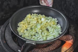Kurz in Butter weich werden lassen. Dadurch schmecken sie milder und geben dem Braten Grundaroma.