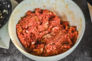 • Das Hackfleisch zusammen mit den Gewürzen, den Essiggurken, den Semmelbröseln und den zuvor angedünsteten Zutaten sowie den Eiern und dem Senf in eine Schüssel geben.