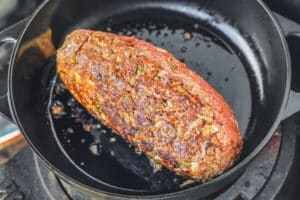 • Den Hackbraten rundherum von drei Seiten anbraten, auf der Unterseite liegen lassen und den Hackbraten mit einem Fleischthermometer versehen.