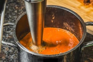 • Den Hackbraten herausnehmen und die Soße optional pürieren, mit Salz und Pfeffer abschmecken und das Ergebnis gerne mit einem Schuss Sahne verfeinern.