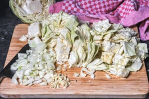 - Spitzkohl putzen, den Strunk entfernen und die Blätter in feine Streifen schneiden. Zwiebeln schälen und würfeln.