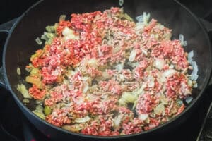 - Das Hackfleisch dazugeben, kräftig anbraten und mit einem Kochlöffel zerkleinern, bis es gleichmäßig gebräunt ist.