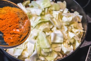 - Spitzkohlstreifen hinzufügen und diese dann auch nochmals mit der zweiten Hälfte der Gewürze würzen.