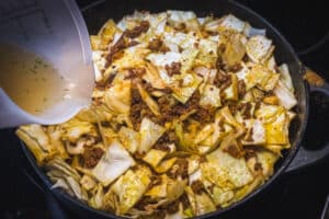 - Alles unterrühren und einige Minuten mitbraten, bis der Kohl leicht zusammenfällt. Mit der Rinderbrühe ablöschen und umrühren.