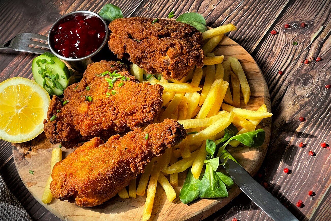 Das Crispy Chicken Rezept ist schnell umgesetzt. Ein bei Groß und Klein beliebtest Fastfood Soulfood. Sauce, Pommes und Salat dazu servieren