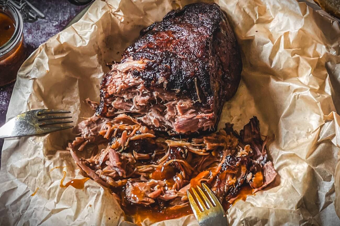 Pulled Pork wird traditionell aus Schweinenacken oder Schweineschulter zubereitet, da diese Fleischstücke vom Schwein viel Bindegewebe und Fett enthalten, was das Fleisch nach langer Garzeit besonders saftig und zart macht.