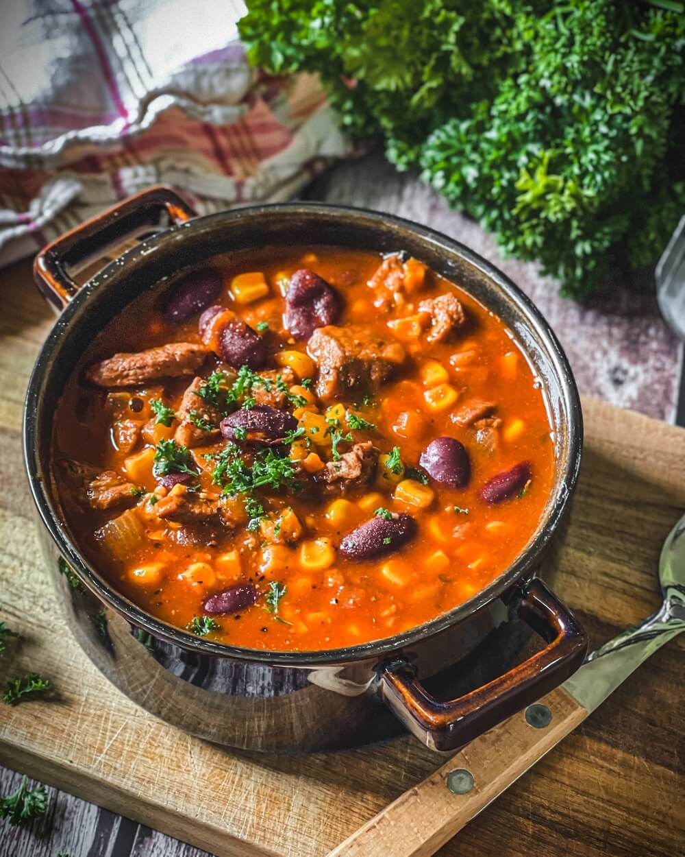 Durch die Mischung aus Fleisch, Bohnen, Mais und rauchigen Gewürzen entsteht ein wärmendes Gericht, das sich das ganze Jahr über servieren lässt. Wer gern mit neuen Rezepten überrascht, findet hier eine abwechslungsreiche Alternative zu Chili Con Carne, der Gulaschsuppe oder anderen Partysuppen.