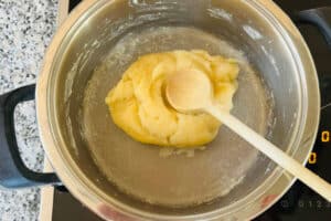 - Dann kräftig rühren, bis sich ein glatter Teigkloß bildet und am Topfboden eine weiße Schicht entsteht, den Teig bei mittlerer Hitze etwa 2 Minuten „abbrennen“ – dabei im Topf hin und her bewegen.
