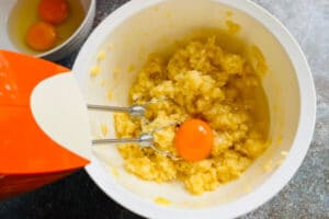 - Die Eier nacheinander mit dem Handrührgerät unterrühren, bis der Teig glatt und glänzend ist.