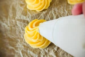 - Den Teig in einen Spritzbeutel mit großer Sterntülle füllen und in Häubchen bzw. Teighäufchen auf ein mit Backpapier ausgelegtes Blech spritzen. Dabei zwischen den Häufchen etwas Abstand lassen, da die Windbeutel beim Backen noch aufgehen.